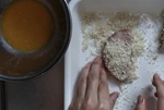 バットに小麦粉を薄く広げボロニアソーセージを並べ、裏面に小麦粉をまぶしたら反対側を上にして小麦粉を振る。
