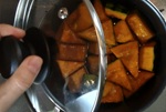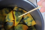 3 かぼちゃを1個ずつひっくり返して、皮側が上になるようにする。弱火のままもう6分煮る。