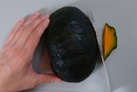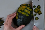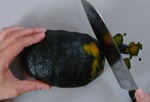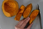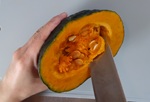 1 かぼちゃの種とワタを取りのぞき、ヘタ部分を切り落とす。