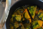 1 片手鍋に、皮を下にしてかぼちゃを並べ、かぼちゃから出た水分も入れ、砂糖(煮つけ分)·顆粒だし·しょうゆ·みりんを入れる。