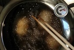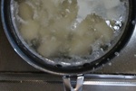 2 いもをゆでる。片手鍋に水を沸騰させ塩を入れる。いもを入れて11分ゆでる。竹串でスッと入るか火通り確認。