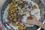 6 木べらに持ち替える。いものボウルに牛ひき肉·玉ねぎ·コーン·砂糖も入れ全体に混ぜ合わせ、いもだねを作る。