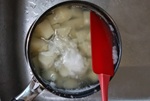 3 火通りOKなら、片手鍋の水を捨てて、弱火で再度火にかける。ゴムベラで鍋底の水気が飛ぶように混ぜる。