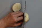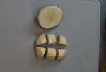 1 じゃがいもは皮をむき、縦に半分に切り、さらに縦に半分にしたら六つ割りに切る。
