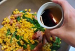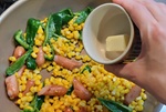 コーンを加え、油が回ってコーンの粉っぽさがなくなるまで混ぜ合わせたら、バターを加える。