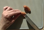 ウインナーソーセージは半分長さに斜めに切る。お弁当用はそれをさらにタコさんに切る。