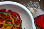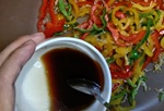 3 ピーマンのかさが少し減ったら、たれを加えて炒め合わせる。お皿に盛ったら、大人はラー油·花椒粉をお好みで。