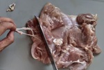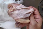 まな板に皮側を下にして置く。包丁で左右に切り開き平らにし、筋は切り取る。