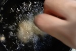 油を熱し強めの中火で180℃まで温度を上げるが、160℃くらいから揚げ始める。油に材料が入ると温度が急速に上がる。180℃以上に高温にならないように火加減を調節し、3分間は揚げる。キツネ色になったら引き上げてキッチンペーパーの上で油を切る。