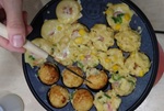 7 何度かひっくり返すとカリっと香ばしくなる。キツネ色になっていればスイッチOFF。具材はすべて火が通っているもの·生食可なので、周りさえ焼けていればOK。