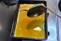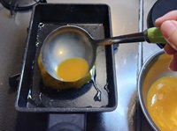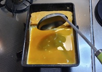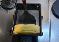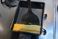 厚焼き卵焼き用フライパンにサラダ油を弱めの中火で熱し、卵液の1/3量を流し込み薄く伸ばして焼く。