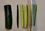 きゅうりを半分長さに切り、さらに縦割りに切る。それを端からお好みの厚さに切り、ずらして並べお好みの幅に切り、スティック状にする。