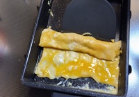再度、手前の空いたスペースに卵液1/3量を流し火が通り始めたら奥から巻いてきて、また押し戻す。