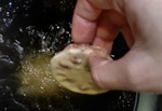 油を熱し170℃まで温度を上げるが、160℃くらいから揚げ始める。揚げ始めると温度が急速に上がるので180℃以上に高温にならないように火加減を調節する。3分間は揚げて火を通し、引き上げてキッチンペーパーの上で油を切る。