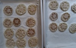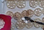 れんこんの上面だけに小麦粉をふり、2枚1セットにしておく。