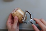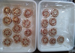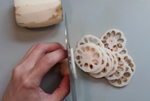 れんこんは皮をむき、2mm幅に輪切りにする。