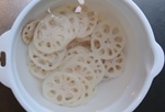 ボウルに水と、酢で酢水をつくる。スライスしたれんこんを30分~1時間浸けて漂白する。浸け終わったら、酢水を捨て、れんこんを良く水洗いし水気を拭く。ここで水洗いが足りないと酢の酸味が残って美味しくないです。