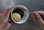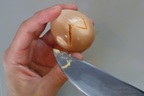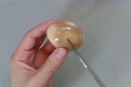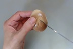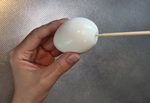 1 殻をむく。殻をむいたら、竹串を玉子の頭とおしりに2cm程度(黄身に到達する程度)刺して穴をあける。
