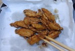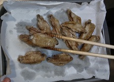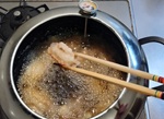1 油を熱し180℃まで温度を上げるが、160℃くらいから揚げ始める。揚げ始めると温度が急速に上がるので180℃以上に高温にならないように火加減を調節する。3分間は揚げて火を通し、引き上げてキッチンペーパーの上で油を切る。