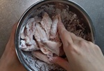 2別のボウルに手羽中を入れ、塩を入れもみ込んだら、片栗粉を合える。ラップをして揚げる直前まで冷蔵庫へ。