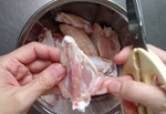 3 手羽中は、骨と肉が離れやすいようにキッチンバサミを入れて、左右に開く。