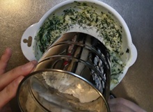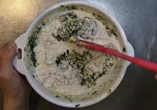 17 ほうれん草クリームに卵白を1/3量混ぜる。その後残りの卵白を全て入れさっくり混ぜる。「さっくり」とはあまりグリグリかき混ぜず、そっと優しく大きな動きでかき混ぜるということ。グリグリすると卵白の気泡が潰れてしまいます。