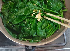 6 ほうれん草をゆでる。フライパンか鍋にたっぷりの熱湯を沸かし、ほうれん草を茎のほうから入れ1分半ゆでる。