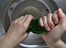 7 ゆで上がったら熱湯を捨て、粗熱が取れたら絞って水気をよく切る。