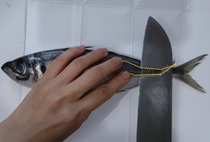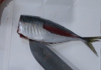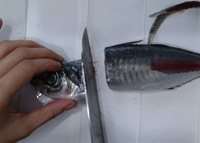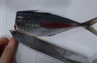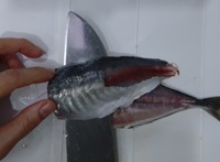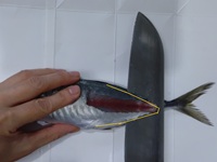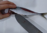 次に胸びれ~頭を落とす。胸びれとはエラのすぐ横から出てる、手みたいな部分(手と思ってしまうのはニモとドリーのせい?)。その手を、裏側も表側もともにバンザイさせて指で押さえ、付け根から包丁を入れ頭を切り落とす。