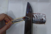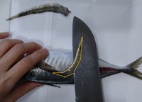 で切ったところから尾に向かって、刃先をすべらせて切腹していく。あまり深く入れずに皮だけ切る感覚。