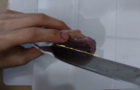 刃を寝かせて、内臓を引っ張り出す。内臓を覆っている膜を破らないように力加減を気を付けながら出すと、まな板も汚れない。ぺりぺりっとはがせます。(破れてドロドロになっても、このあと水洗いするので大丈夫)