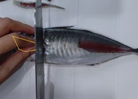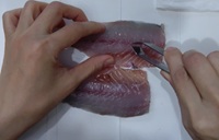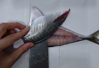 さっき切り落とした部分の腹側にちょうど、コリコリした腹びれがある。その腹びれを三角形に切り取る。