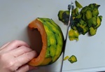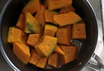 1 かぼちゃのヘタと皮と種·ワタを取り除き、4cm角に切る。