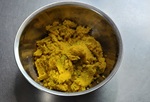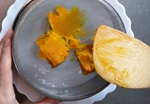 3 かぼちゃを裏ごしする。裏ごししたものはボウルに移すが、大きいボウルは5で使うので取っておく。また、かぼちゃは個体の個性があるので、裏ごししたものがペースト状だったり·もさもさ状だったり、毎回品質が安定しませんが美味しさは変わりないので気にしない。