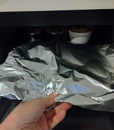 2 焼き60分のうち、ラスト15分くらいで焦げ始める。アルミホイルを差し入れて、焦げ過ぎないようにする。