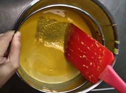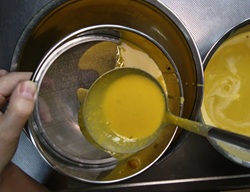 5 プリン液を、再度裏ごしする。濾し器の中に残った分もヘラで押し出し、なるべく残さず液に入れる。