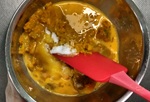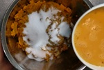 3 砂糖と卵を加え混ぜ、なめらかにする。