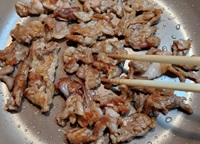 4 フライパンに油を足し、中火で豚肉を美味しそうな色が付くまで、途中ひっくり返しながら煎り焼きにする。
