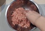 大き目のボウルに豚ひき肉と、細かくした豚肉を入れ、こね用の塩·こしょうを入れ粘り気が出るまで練る。豚肉の脂がクリーム状に変化し、まとまってくる。