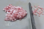 しょうが焼き用豚肉を5mm角に切る。端から5mm幅に細切りにしたものを向きを変えてさらに5mm幅。