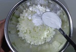玉ねぎはボウルに入れ、まぶし用の片栗粉をまんべんなくまぶす。