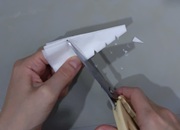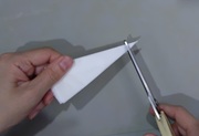 13 シートを半円に折って、さらに折って・・・を繰り返し、とがらせたら、先端を切り落とす。長辺にも切り込みを入れて穴を空ける。蒸気の通気口です。