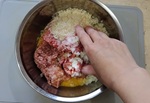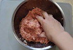 2 ボウルにひき肉·塩こしょう·玉ねぎ·卵·パン粉·牛乳、を入れ力を込め練る。ポロポロのひき肉が、脂がクリーム状に変化し、まとまってくる。