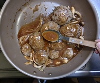 11 フライパンを傾け、スプーンでソースをハンバーグにかけながら中火で2~3分煮込む。