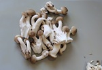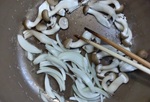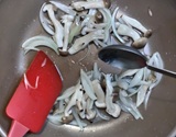 6フライパンに、野菜炒め用バターを入れ、しめじと玉ねぎうす切りを入れ炒める。