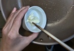 3 中の空気を抜く。この肉だねは手に付きやすいので、サラダ油少量を手の平につけてから。利き手に肉だねを持ち、逆の手にキャッチボール。20回くり返す。