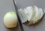 2 玉ねぎ100 gをくし切りの薄切りにする。これはソース用。