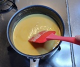 1 鍋にポタージュベースと人参ペーストを入れ、弱火にかけながら混ぜ合わせる。